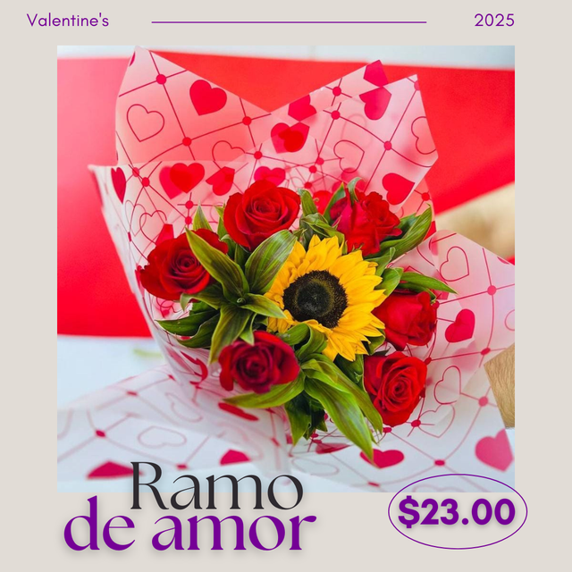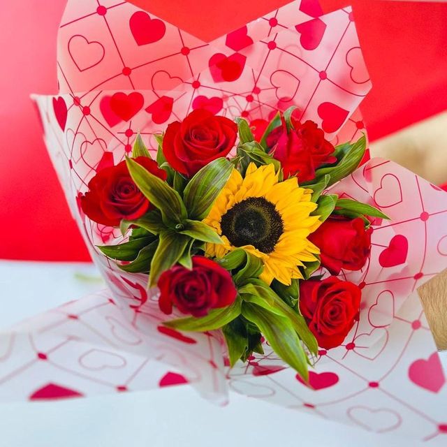 6 rosas rojas más un hermoso girasol