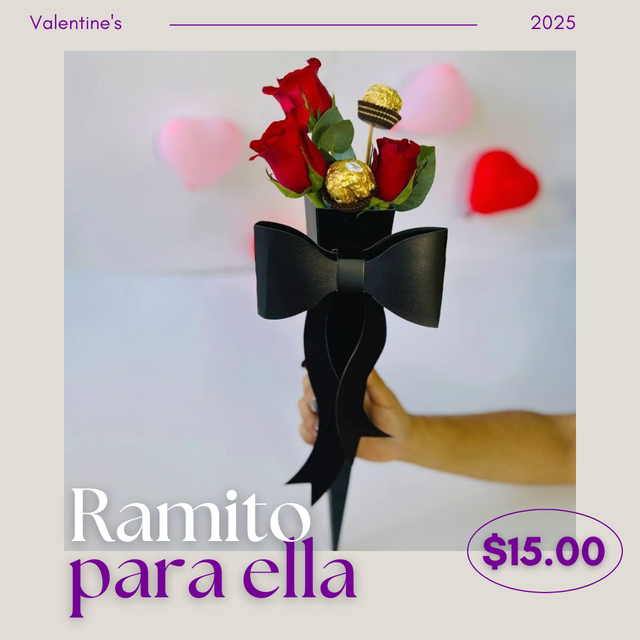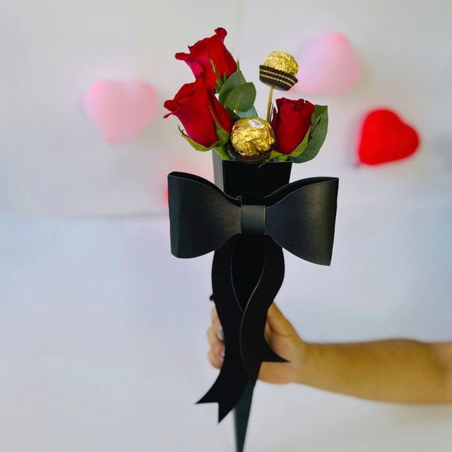 2 Ferrero Rocher y tres rositas en empaque especial. ¡Sencillo pero hermoso!