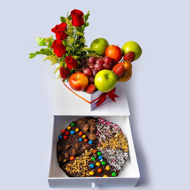 Fruta + 4 rosas + 1 brownie de 8 porciones + caja tipo gavetero